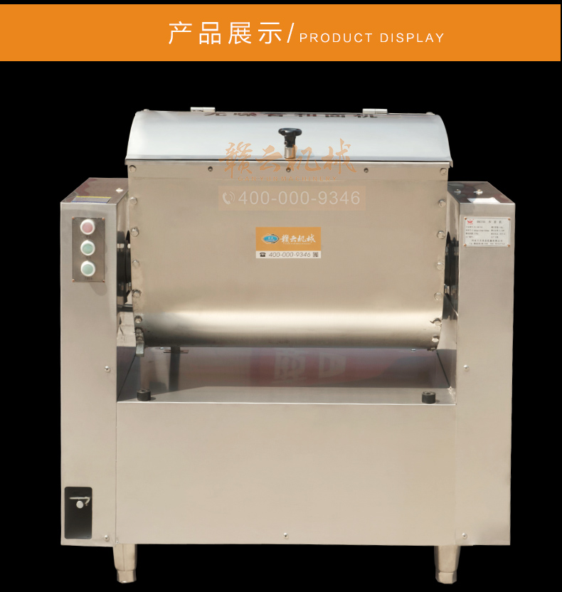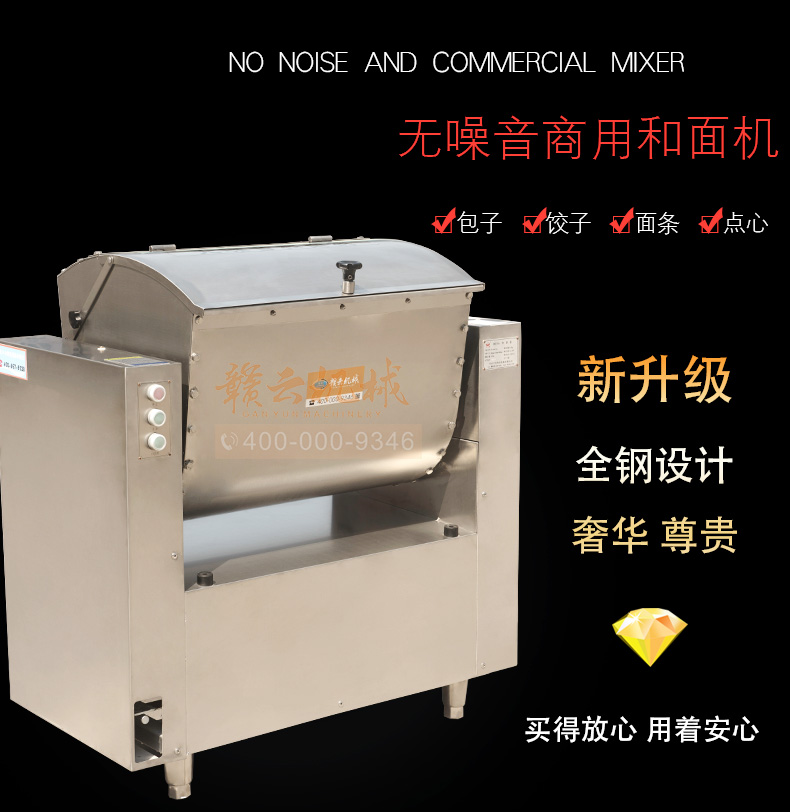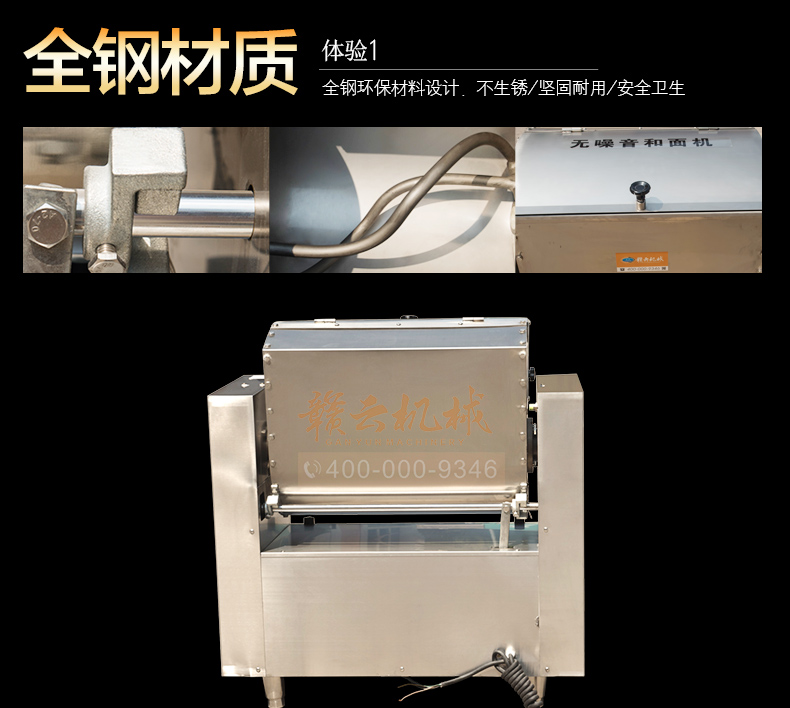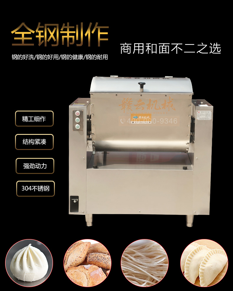 全鋼和面機,工程系列50kg和面郎,整機外殼不銹鋼材質,絞龍和和面桶均為食品級不銹鋼,安全衛生,適合中央廚房面點加工,面食加工廠生產和面攪拌之用。本系列產品有25kg和50kg兩種款式