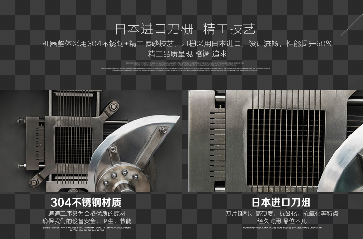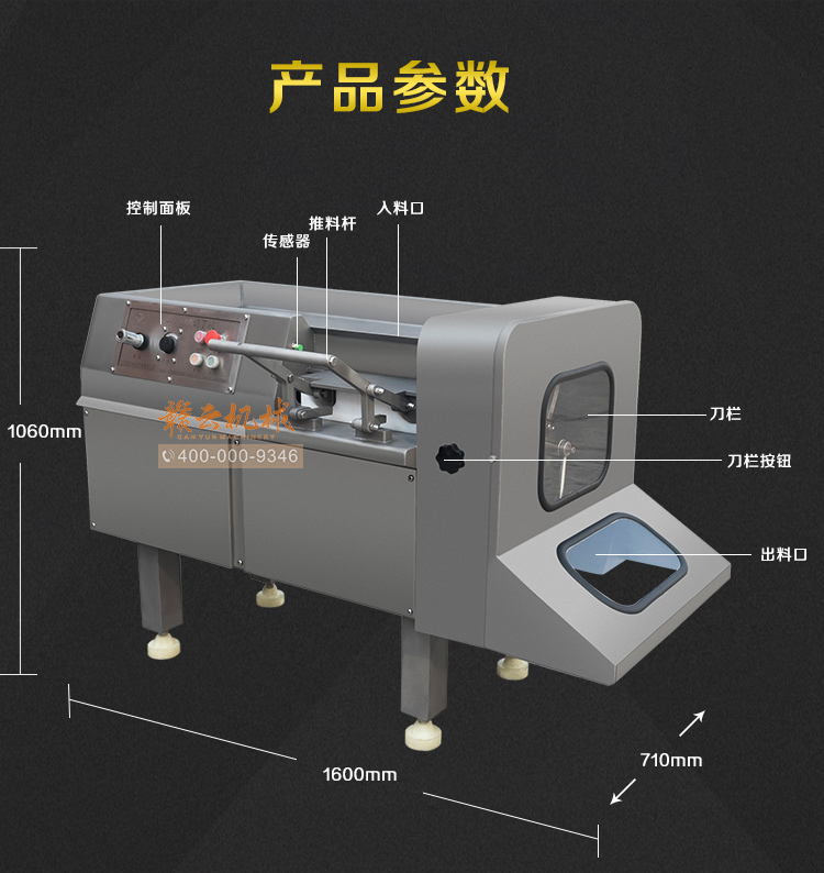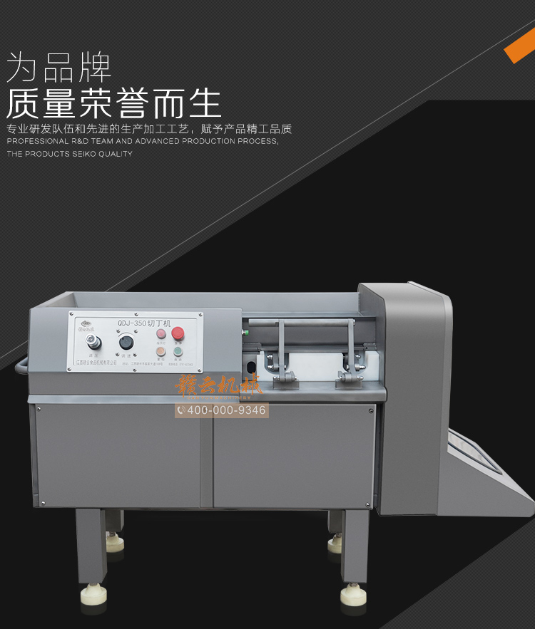 本設(shè)備采用全304不銹鋼構(gòu)架,高級噴砂處理,激光雕刻,利用液壓推料設(shè)計(jì),步進(jìn)式進(jìn)料,全自動切割,配合日本原裝進(jìn)口刀具,鋒利切割,速度快,切割長度可調(diào),寬度規(guī)格可定制,并配備安全感應(yīng)雙保護(hù)設(shè)置,整體外形美觀大氣,是肉類食品加工專用切丁設(shè)備。