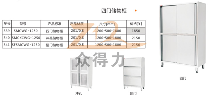 江西眾得力廚具有限公司生產銷售食品機械和商用廚具系列設備,為您提供中央廚房整體解決方案。本產品為四門儲物柜系列,有沖孔、翻門 四門之分,均為四層儲物柜系列。