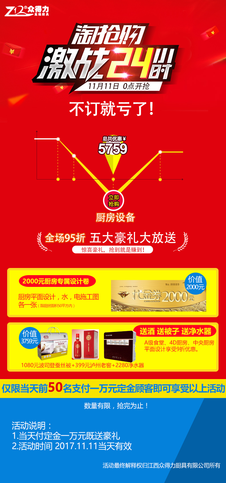 江西眾得力廚具有限公司雙11期間,舉辦訂廚房設(shè)備送豪禮活動(dòng),現(xiàn)場(chǎng)火爆,豪禮大放送,預(yù)付1萬元廚房設(shè)備定金,獲5759元精美禮品大禮包